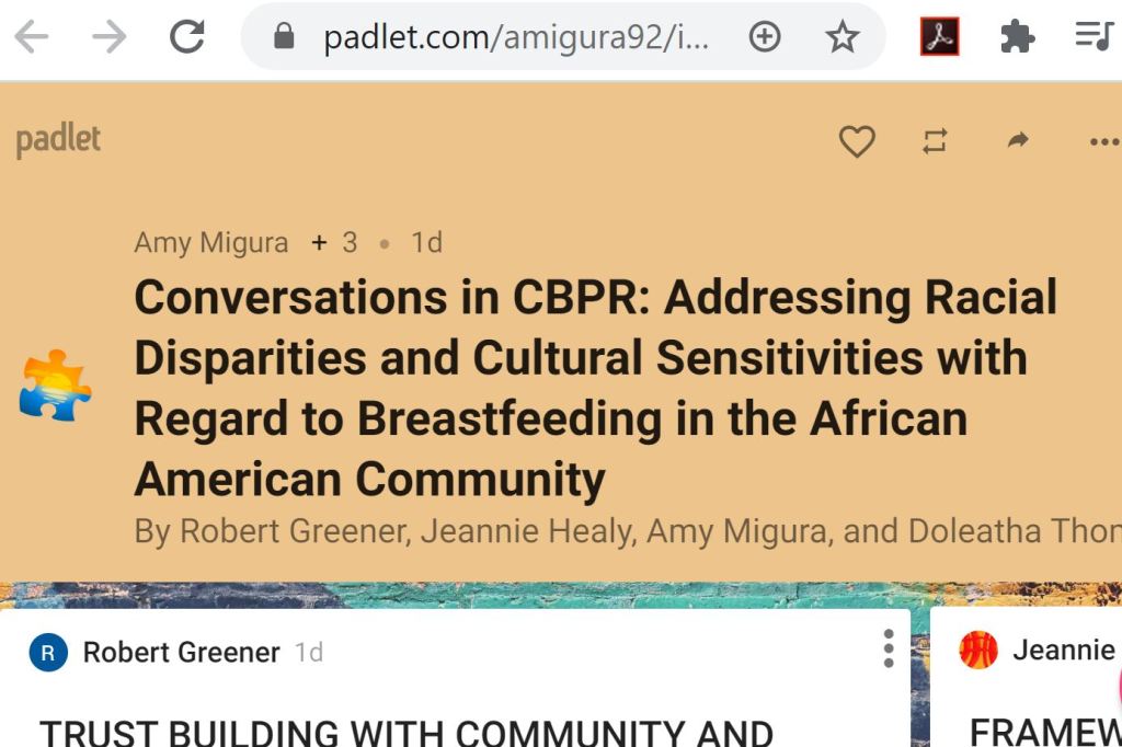 This padlet examines challenges and barriers facing African American mothers when it comes to breastfeeding their children–and how they could be addressed via CBPR. We offer four different perspectives on the issue, including: